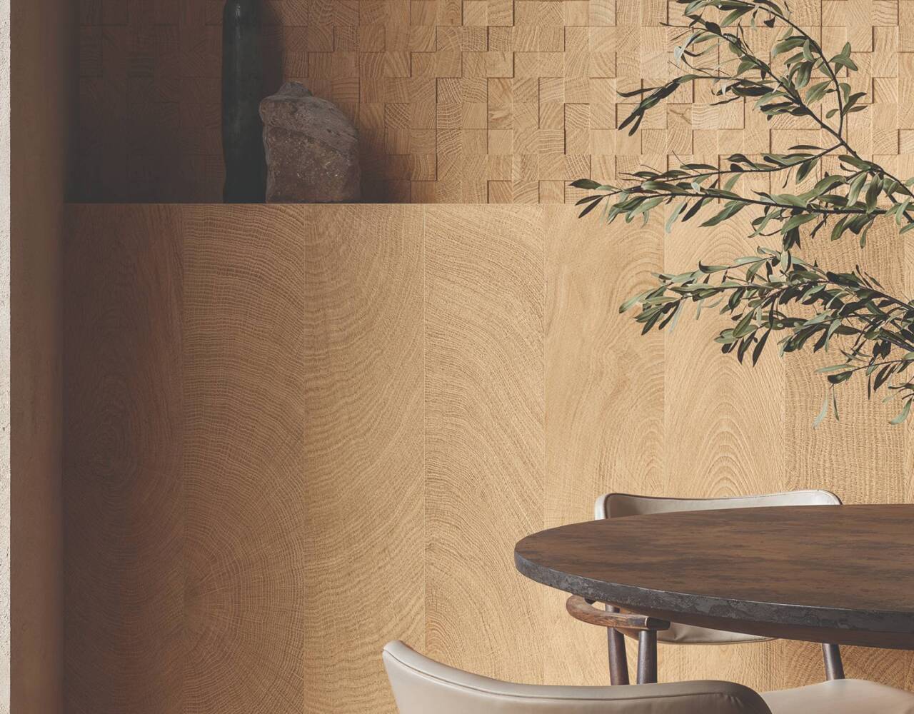 Inspired by the poetic rhythm of tree rings, Annuli captures the timeless dialogue between nature and architecture. Available in three sophisticated colors, the range includes 4″×4″, 2.5″×12″ bricks, and 4″×48″ and 8″×48″ planks, alongside the striking 24″×48″ 3D Slats décor featuring a sculptural slat motif. The collection is further enriched with the 2″×2″ Mosaics and the 3D Cube mosaic, whose wood-look geometry adds depth and dynamism to interior and exterior spaces.