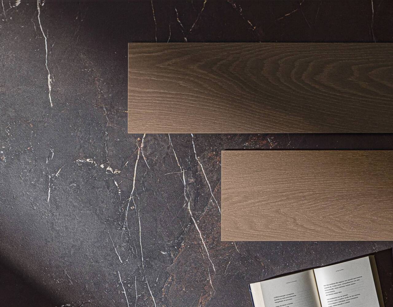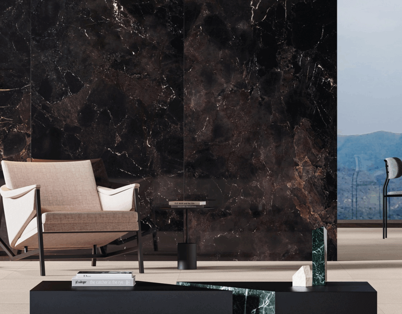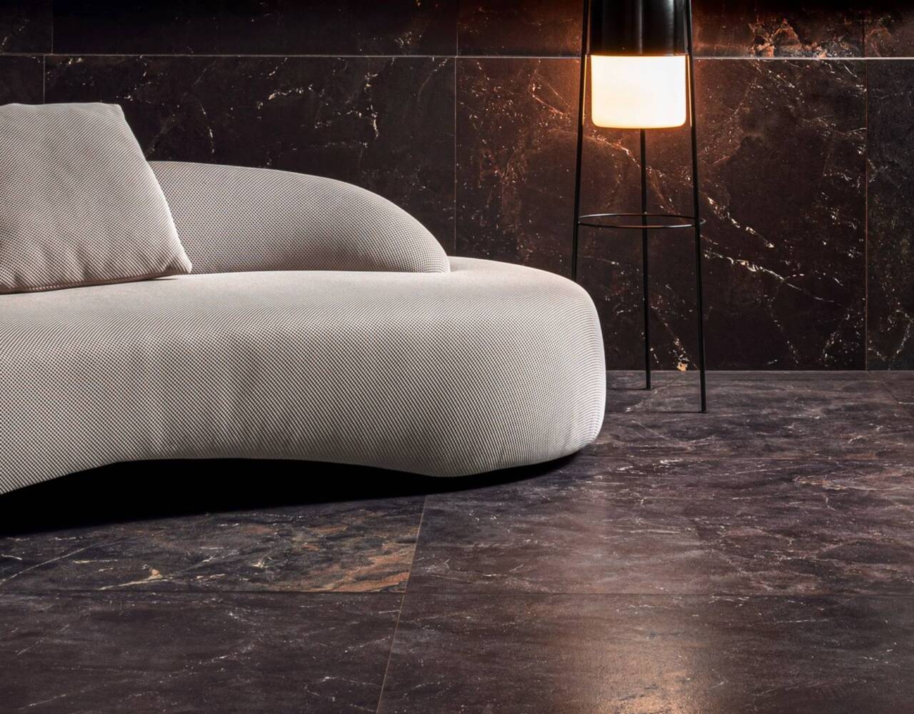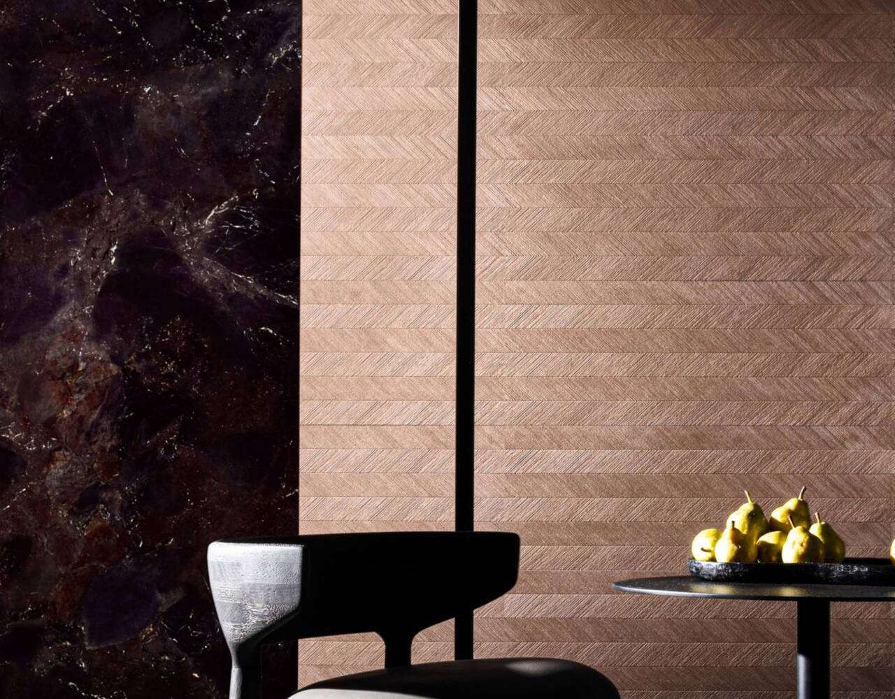 A refined interplay of stone strength and leather-like texture. Sauvage features deep black-brown tones, sculptural reliefs, and rich surface details. Available in large format sizes in both matte and polished finishes.